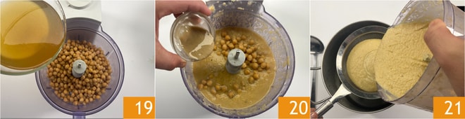 Geben Sie die Kichererbsen in einen Mixer, fügen Sie etwas von ihrem Kochwasser hinzu 19 und pürieren Sie sie 5 Minuten lang. Fügen Sie nun das Venusmuschelwasser hinzu und pürieren Sie weitere 5 Minuten. Fügen Sie die Tahini hinzu 20 und pürieren Sie erneut 5 Minuten lang, bis Sie eine glatte und homogene Creme erhalten. Sollte die Creme nicht cremig genug sein, können Sie weiteres Kichererbsen-Kochwasser hinzufügen. Filtern Sie die Creme durch ein Sieb in einen Topf 21 und erwärmen Sie sie vorsichtig.