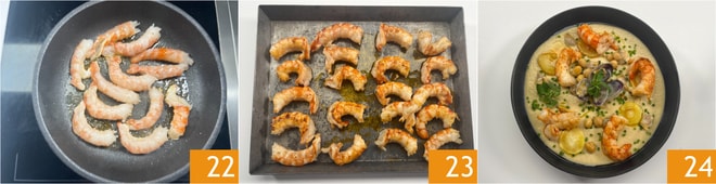 Erhitzen Sie etwas Öl in einer Pfanne und braten Sie die Garnelen 22 bis sie goldbraun sind 23. Sie sind bereit zum Anrichten: Verteilen Sie die heiße Kichererbsencreme auf dem Boden des Tellers, bestreuen Sie mit fein gehacktem Schnittlauch und legen Sie die Pastinakescheiben darauf. Fahren Sie fort mit den geschälten Venusmuscheln, den beiseite gehaltenen mit Schale, den Garnelen, den ganzen Kichererbsen und einigen frischen Oreganoblättern. Ihre Kichererbsencreme mit Garnelen, Venusmuscheln und Pastinake ist bereit zum Servieren 24!