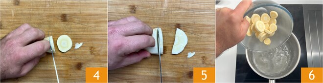 Schneiden Sie den kleineren Teil der Pastinake in 1 cm dicke Scheiben 4. Teilen Sie den größeren Teil zunächst in der Hälfte und schneiden Sie dann halbmondförmige Scheiben von ebenfalls 1 cm Dicke 5. Blanchieren Sie die Pastinake ein paar Minuten 6.