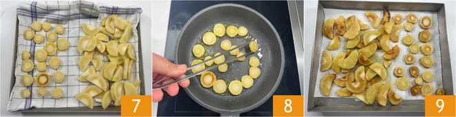Lassen Sie die Pastinake abtropfen und auf einem sauberen Tuch trocknen 7. Geben Sie etwas Öl in eine Pfanne, legen Sie die Pastinakescheiben hinein, salzen Sie und braten Sie sie auf beiden Seiten an 8. Wenn sie goldbraun sind, legen Sie die Scheiben auf Küchenpapier, um das überschüssige Öl zu entfernen 9.