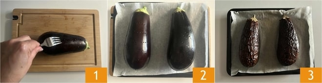 Um die Auberginencreme zuzubereiten, waschen Sie die Auberginen, legen Sie sie auf ein Schneidebrett und stechen Sie sie mit einer Gabel ein 1; dieser Schritt ist wichtig, um ein Aufplatzen beim Kochen zu verhindern. Sobald beide vorbereitet sind, legen Sie sie auf ein mit Backpapier ausgelegtes Backblech 2, ohne etwas hinzuzufügen. Backen Sie sie bei 200°C im statischen Modus für etwa 45 Minuten auf der mittleren Schiene des Ofens 4.