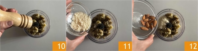 Fügen Sie nun eine Prise Salz, eine Prise Pfeffer 10, den geriebenen Parmesan 11 und die Mandeln hinzu 12.