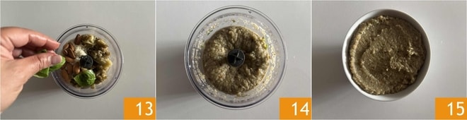 Als nächstes fügen Sie das Basilikum hinzu 13, dann schließen Sie den Mixer und pürieren alles, bis eine homogene Creme entsteht 14. Geben Sie sie in eine kleine Schüssel 15.