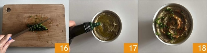 Nehmen Sie dann die Petersilie und hacken Sie sie fein 16. Verfeinern Sie die Auberginencreme mit einem Schuss Öl 17, der fein gehackten Petersilie und einer Prise Chili 18! Servieren Sie sie sofort oder bewahren Sie sie im Kühlschrank auf!