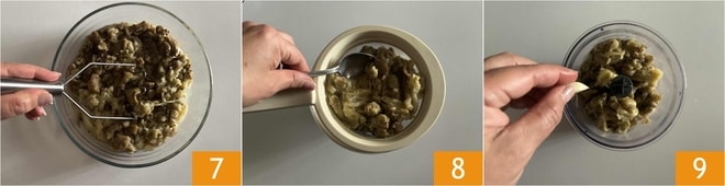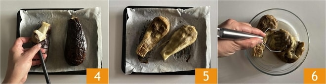 Drücken Sie sie dann leicht 7 mit dem entsprechenden Werkzeug oder mit einer Gabel. Legen Sie das Auberginenfleisch in ein Sieb über eine Schüssel und drücken Sie leicht mit einem Löffel, um überschüssiges Wasser abtropfen zu lassen 8. Geben Sie es dann in einen Mixer und fügen Sie die geschälte Knoblauchzehe hinzu 9.