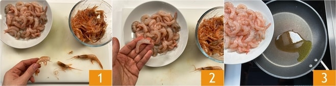 Um die cremige Pasta mit Zucchini und Garnelen zuzubereiten, beginnen Sie mit der Reinigung der Garnelen: Entfernen Sie vorsichtig den Kopf mit den Händen 1, dann entfernen Sie auch den Panzer und ziehen Sie mit einem Zahnstocher den inneren Faden heraus 2. Verfahren Sie auf diese Weise auch mit allen anderen. Erhitzen Sie eine Pfanne, geben Sie einen Schuss Öl hinzu und fügen Sie die Garnelen hinzu 3. Braten Sie sie kurz bei starker Hitze an.