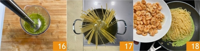 Pürieren Sie sie mit einem Stabmixer 13, indem Sie einen Löffel rohes Öl und ein paar Kellen Nudelwasser hinzufügen 15.