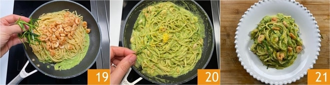 Pürieren Sie weiter, bis Sie eine glatte Creme erhalten 16, und geben Sie sie erneut in die Pfanne. Kochen Sie inzwischen die Linguine und lassen Sie sie al dente abtropfen; geben Sie sie direkt in die Pfanne.