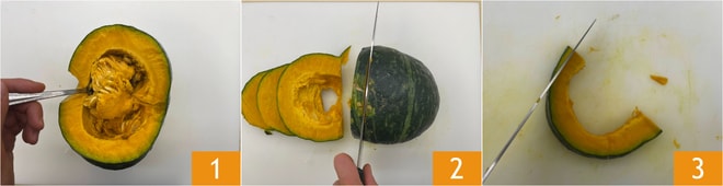 Um die cremigen Spaghetti mit Kürbis und Gorgonzola zuzubereiten, beginnen Sie mit der Reinigung des Kürbisses: Halbieren Sie ihn, entfernen Sie die Kerne 1, schneiden Sie ihn in Scheiben 2, so lässt sich die Schale leichter entfernen 3.