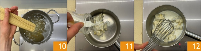 Kochen Sie die Spaghetti nur 2-3 Minuten lang 10. In der Zwischenzeit bereiten Sie das Fondue vor: Geben Sie den Gorgonzola und die Milch in einen kleinen Topf 11, schmelzen Sie den Käse bei geringer Hitze unter Rühren mit einem Schneebesen 12 bis Sie eine glatte Creme erhalten.