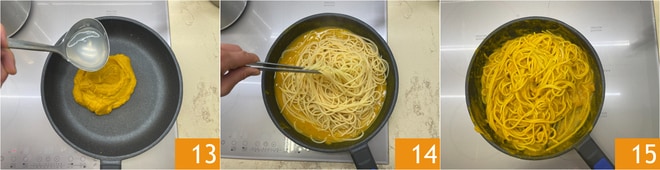 Geben Sie die Kürbiscreme in eine Pfanne 13, verdünnen Sie sie mit etwas Kochwasser 13. Gießen Sie hier die Spaghetti ab 14, kochen Sie sie fertig, indem Sie bei Bedarf heißes Wasser hinzufügen 15.