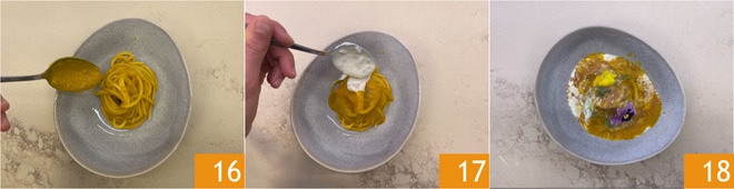 Servieren Sie die Pasta mit der Sauce 16, dem Fondue 17, essbaren Blüten, zerbröselten Amaretti, Thymian und Majoran nach Belieben. Die cremigen Spaghetti mit Kürbis und Gorgonzola 18.