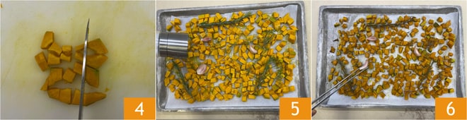 Schneiden Sie ihn in etwa 1,5 cm große Würfel 4. Legen Sie den Kürbis auf ein mit Backpapier ausgelegtes Blech, würzen Sie mit Knoblauch, Rosmarin, Thymian, Salz 5 und Öl. Im Ofen bei 180° für 30/35 Minuten garen. Entfernen Sie am Ende der Garzeit den Knoblauch und die Kräuter 6.