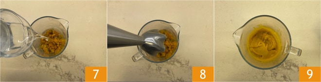 Geben Sie den gegarten Kürbis in ein hohes Gefäß, fügen Sie etwas heißes Wasser hinzu, passen Sie die Menge je nach Konsistenz an 7. Pürieren Sie mit dem Stabmixer 8, um eine samtige Creme zu erhalten 9.