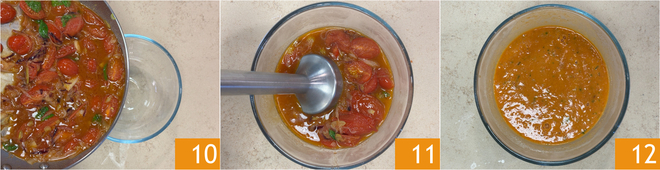 Übertragen Sie die Sauce in ein Gefäß 10 und pürieren Sie sie mit einem Stabmixer 11, um eine homogene Sauce zu erhalten 12. Wenn gewünscht, können Sie die Sauce durch ein Sieb streichen, um sie noch glatter und samtiger zu machen.<\/p>
