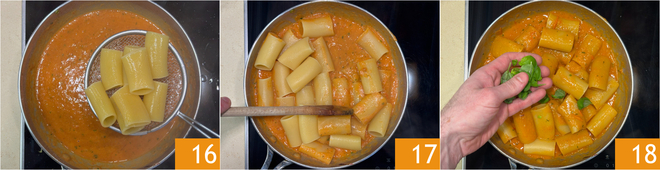 Zu diesem Zeitpunkt sind die Nudeln gekocht, also schöpfen Sie sie direkt in die Pfanne mit der Sauce 16 und rühren Sie vorsichtig um 17. Zum Schluss fügen Sie noch einige Basilikumblätter hinzu 18.<\/p>