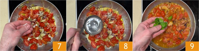 Salzen Sie 7 und fügen Sie einen Schöpflöffel des Nudelkochwassers hinzu 8. Kochen Sie bei mittlerer Hitze etwa 15 Minuten lang, danach duften Sie mit Basilikumblättern 9 und schalten Sie die Hitze aus.<\/p>