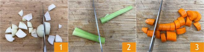 Um die Wirsing-Kartoffel-Cremesuppe zuzubereiten, bereitet zuerst etwa 1,5 l Gemüsebrühe zu und haltet sie warm; schneidet und putzt dann grob die Zwiebeln 1 und den Sellerie 2. Anschließend putzt, schneidet und entkomt auch die Möhre 3.