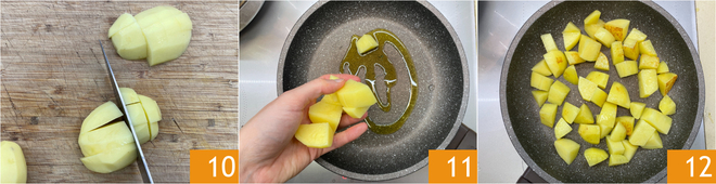 In der Zwischenzeit die Kartoffeln schälen und würfeln 10. Bratet die Kartoffelwürfel in einer Pfanne mit etwas Öl für wenige Minuten goldbraun an 11 12.