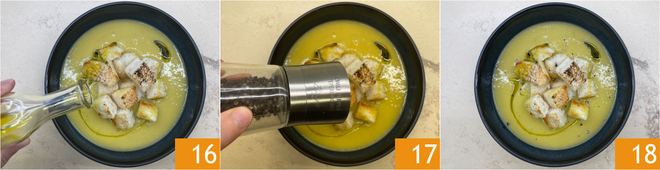 Richtet die Cremesuppe an und garniert sie mit gerösteten Brotwürfeln oder Crostini, gebt dann einen Schuss Olivenöl darüber 16 und frisch gemahlenen Pfeffer nach Belieben 17. Eure Wirsing-Kartoffel-Cremesuppe ist servierbereit 18!