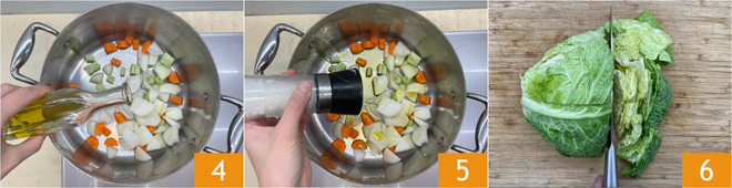 Gebt das vorbereitete Gemüse in einen großen Topf, fügt einen Schuss Öl 4 und eine Prise Salz 5 hinzu und lasst alles bei mittlerer bis niedriger Hitze 5–7 Minuten andünsten, dabei gelegentlich umrühren. In der Zwischenzeit den Wirsing grob putzen und schneiden 6.