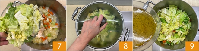Gebt den Wirsing in den Topf 7, deckt ihn ab und lasst ihn ein paar Minuten schmoren 8. Wenn der Wirsing sichtbar zusammengesackt ist, gießt die heiße Gemüsebrühe dazu 9.