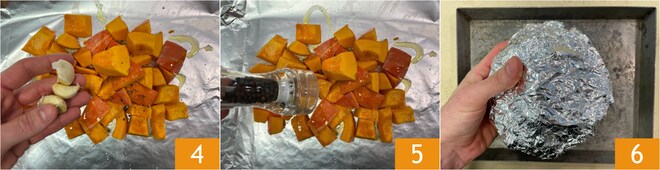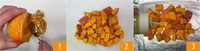 Um das cremige Kürbis- und Quartirolo-Risotto zuzubereiten, waschen Sie zuerst den Kürbis, entfernen Sie dann die Samen und die inneren Fasern 1 und schneiden Sie das Fruchtfleisch in Würfel, ohne es zu schälen 2. Legen Sie sie auf ein Stück Alufolie und würzen Sie mit Öl 3.