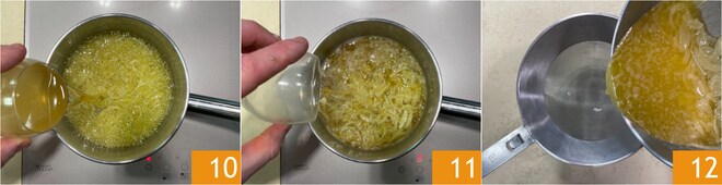 Wenn die Butter bernsteinfarben ist und die Zwiebeln weich geworden sind, fügen Sie den Weißwein 10 und den Essig hinzu 11. Lassen Sie es einige Minuten kochen, dann durch ein Sieb abseihen 12 und alles im Kühlschrank fest werden lassen.