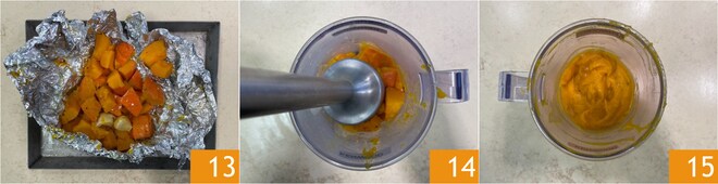Wenn der Kürbis fertig ist 13, geben Sie ihn in einen Messbecher, entfernen Sie die Knoblauchzehen und pürieren Sie ihn mit einem Stabmixer 14, bis eine weiche und seidige Creme entsteht 15.