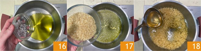 In einem Topf fügen Sie das Öl und die fein gehackte Schalotte mit dem Messer hinzu 16 und lassen Sie sie goldbraun werden. Geben Sie den Reis in den Topf 17 und rösten Sie ihn ein paar Minuten. Befeuchten Sie mit der Gemüsebrühe 18. Kochen Sie den Reis, indem Sie eine Kelle hinzugeben, sobald die vorherige absorbiert wurde.