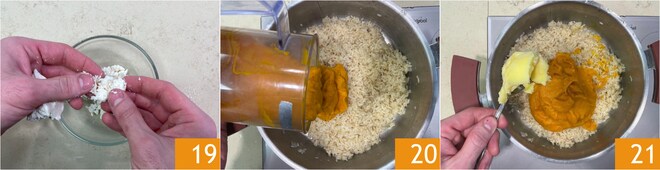 In der Zwischenzeit zerkleinern Sie den Quartirolo grob 19. Wenn der Reis gar ist, fügen Sie die Kürbiscreme 20 und die kalte saure Butter 21 hinzu.