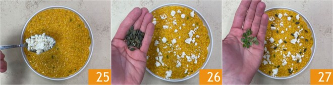 Fügen Sie den Quartirolo auf der Oberfläche des Risottos hinzu 25. Garnieren Sie mit den gerösteten Kürbiskernen 26 und einigen Majoranblättern 27. Ihr cremiges Kürbis- und Quartirolo-Risotto ist bereit zum Genießen!
