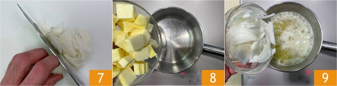 Um die saure Butter herzustellen, schneiden Sie zuerst die Zwiebel in Julienne 7. Schmelzen Sie die Butter in einem kleinen Topf 8 und fügen Sie die Zwiebel hinzu 9.