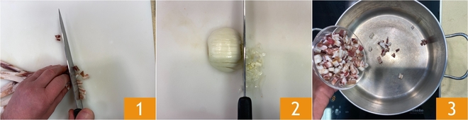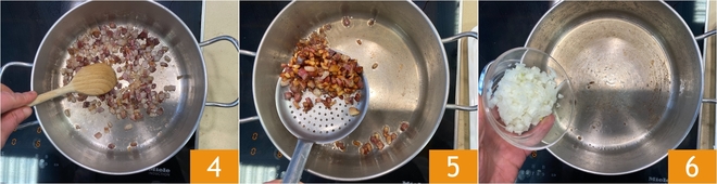 Bratet sie bei starker Hitze an 4, bis sie goldbraun ist 5, und gebt sie dann auf Küchenpapier, damit überschüssiges Fett abtropfen kann. Im selben Topf nutzt ihr das Fett der Pancetta, um die gehackte Zwiebel einige Minuten anzuschwitzen, bis sie weich wird 6.