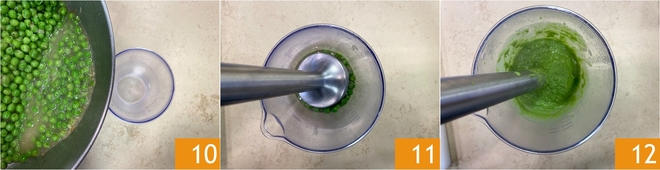 Wenn sie fertig sind, gebt die Hälfte in ein hohes Gefäß 10 und püriert sie mit dem Stabmixer 11, bis eine glatte Creme entsteht 12. Den Rest für die endgültige Garnitur beiseitelegen.