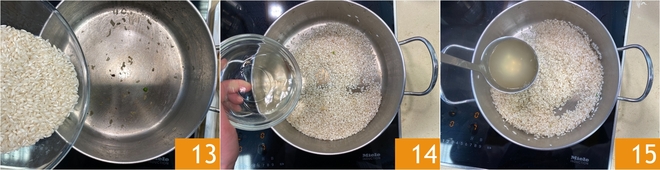 Jetzt zum Reis: Röstet den Carnaroli im selben Topf ohne zusätzliches Fett für ein paar Minuten 13, löscht mit dem Weißwein ab 14 und lasst den Alkohol verdampfen. Beginnt, die Brühe nach und nach zuzugeben 15 und rührt häufig.