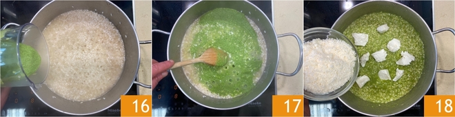 Zur Mitte der Garzeit gebt ihr die Erbsencreme dazu 16 und kocht weiter, bis die Reiskörner al dente sind 17. Sobald ihr den Herd ausschaltet, verfahrt ihr mit Butter und Parmigiano zur Verfeinerung 18.