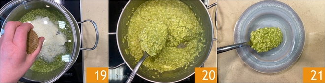 Deckt den Topf ab 19, lasst alles zwei Minuten ruhen und rührt dann um, damit sich alles gut verbindet 20. Zum Schluss richtet ihr das Risotto an 21.