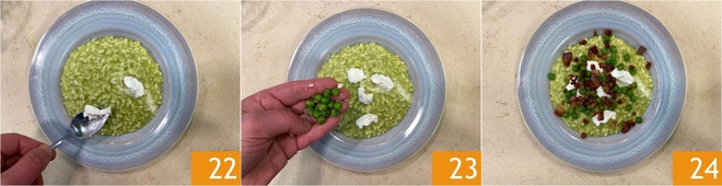 Garnieren mit Tupfen Crescenza 22, den beiseitegelegten ganzen Erbsen 23 und der knusprigen Pancetta. Das Risotto mit Erbsen, Crescenza und knuspriger Pancetta ist servierbereit 24.