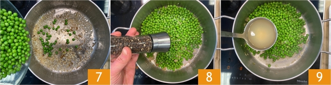 Gebt nun die Erbsen dazu 7 und lasst sie etwa sieben Minuten mit einer Prise Salz, Pfeffer 8 und einer Kelle Gemüsebrühe 9 garen.