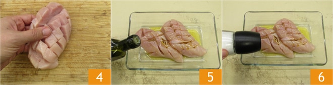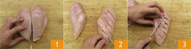 Um die cremige Hähnchenbrust zuzubereiten, reinigen Sie die Hähnchenbrust von Fett und Knochen und teilen Sie sie in zwei Hälften 1. Mit einem scharfen Messer schneiden Sie die Oberfläche des Huhns schräg von beiden Seiten ein, ohne ganz durchzuschneiden 2 3.