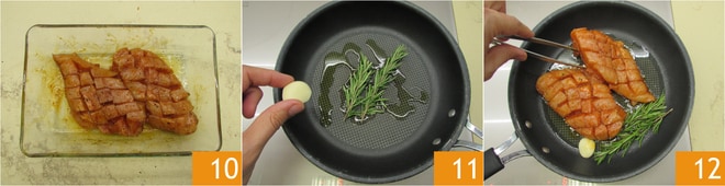 Massieren Sie das Huhn, um die Gewürze durch die Schnitte eindringen zu lassen 10. Erhitzen Sie das Öl in der Pfanne mit Rosmarin und Knoblauch 11. Legen Sie das Huhn hinein 12. Braten Sie es bei mittlerer bis hoher Hitze, bis es auf der Unterseite gebräunt ist, das dauert etwa 6-7 Minuten.