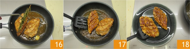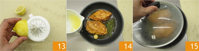 In der Zwischenzeit den Zitronensaft auspressen 13. Wenden Sie das Huhn und löschen Sie es bei weiterhin mittlerer bis hoher Hitze mit dem Zitronensaft ab 14, decken Sie es mit einem Deckel ab und kochen Sie es auch auf der anderen Seite 15 weitere 6 oder 7 Minuten.