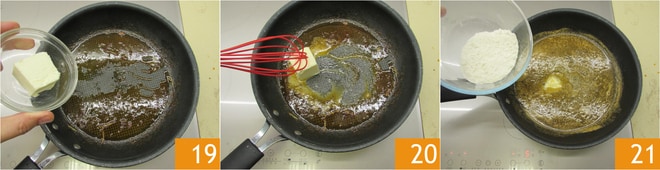 In derselben Pfanne die Butter 19 hinzugeben und schmelzen lassen 21. Mehl hinzufügen 21 und unter Rühren mit dem Schneebesen rösten.