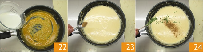 Gießen Sie die Milch in mehreren Portionen bei Zimmertemperatur ein, rühren Sie dabei ständig mit dem Schneebesen, und lassen Sie die Soße eindicken 22. Würzen Sie mit Salz, Muskatnuss 23 und Rosmarin 24.