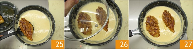 Legen Sie das Huhn wieder in die Pfanne 25, decken Sie es mit dem Deckel ab 26 und kochen Sie es noch 2 Minuten weiter. Garnieren Sie die cremige Hähnchenbrust nach Belieben mit Zitronenschale und Rosmarin und servieren Sie sie 27.