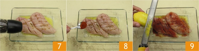 Pfeffer 7, Paprika 8 und Zitronenschale 9 würzen.