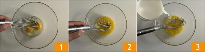 Um die Crêpes ohne Butter zuzubereiten, geben Sie die ganzen Eier in eine Schüssel 1 und schlagen Sie sie mit einem Schneebesen 2. Gießen Sie die Milch in einem dünnen Strahl ein 3.