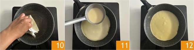 Entfernen Sie eventuell überschüssiges Öl mit einem Küchentuch 10. Gießen Sie eine Schöpfkelle Teig ein 11, bis der Boden bedeckt ist 12.