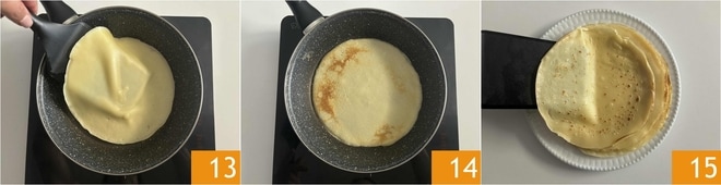 Nach etwa einer Minute, bei mittlerer Hitze, werden Sie bemerken, dass sich die Ränder von der Pfanne lösen und leicht goldbraun werden. Drehen Sie die Crêpe mit einem Spatel um 13 und braten Sie sie auch auf der anderen Seite 14. Übertragen Sie die Crêpes auf einen Teller, indem Sie sie übereinander stapeln (15). Die Crêpes ohne Butter sind fertig, Sie können wählen, ob Sie sie in süßer oder herzhafter Form servieren möchten.